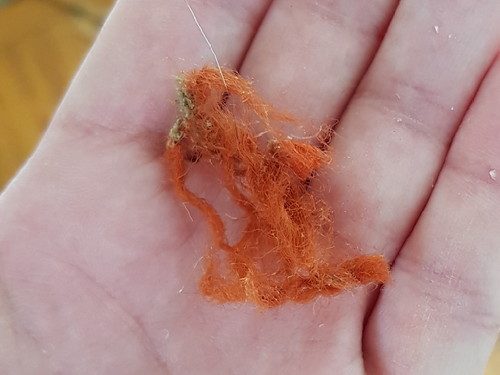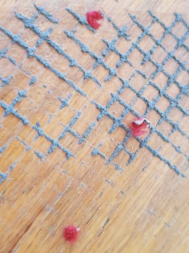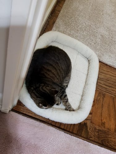 Cat barrier. The stain dries fast, but some spots soak in more slowly, and I didn’t want Miffy walking on it and getting stain on his little circle feet, then cleaning himself and getting poisoned. Not that it mattered because when I lay down to rest my poor knees and back, and wait for stain to dry, I called Miff so he could lie down on me, and he didn’t come. Eventually, I heard a tiny cry, and he’d somehow got trapped behind the barricades. He walked only down 9′ of hallway, and it was the first part I’d done, so his circles were safe, but I did leave the barricades up after I’d sprung him from the plastic prison.