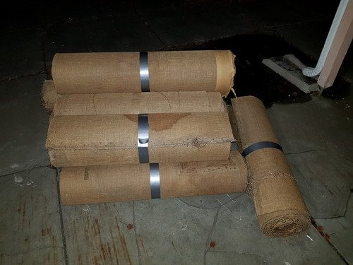 Having no truck to haul this to the dump (and no idea where the dump might be anyway), I just cut it up into manageable strips, rolled and taped it, and put it outside. P has been putting as much foam as will fit into our trash can each week, and once the foam is gone, we’ll do the same with the carpet. It’s all stained with god knows what (and I don’t want to know), and it was ugly to begin with, so it’s not worth keeping. I might keep a little to make cat scratch-y things, but I’ll pressure wash it and let it dry fully before I bring any of it indoors!