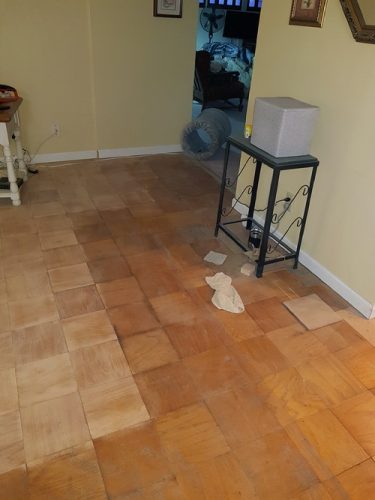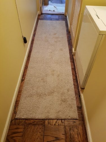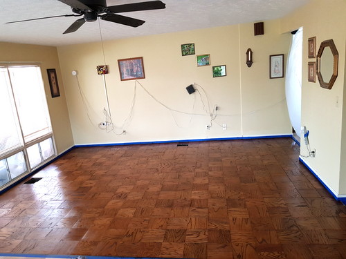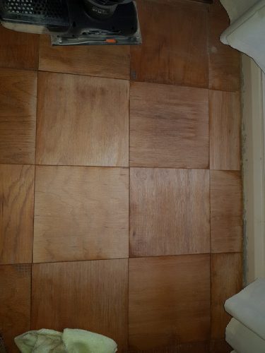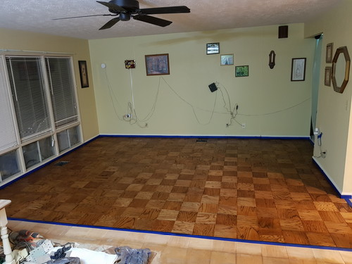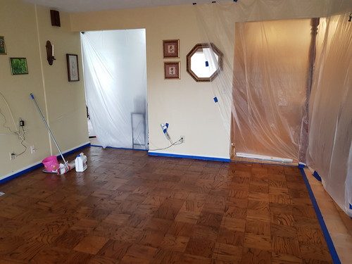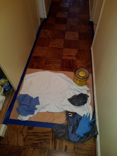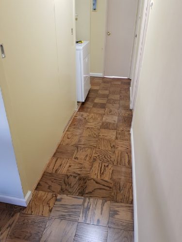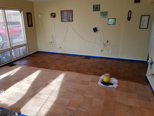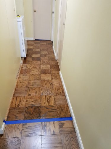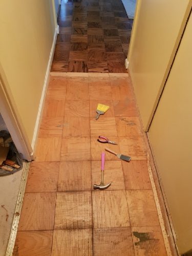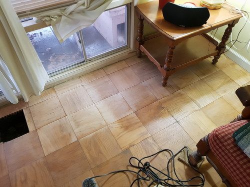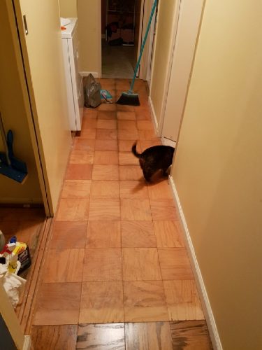 At that point, I discovered that there had once been rubber-backed carpeting that had stuck to the parquet. Not what I wanted, but I work with what I have because I can’t afford to replace an 18′ x 24′ room and two short hallways with brand new hardwood. Honestly, I’d rather keep the original flooring because nobody else did. Well, most people just ripped it up, so I have to be contrary!