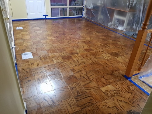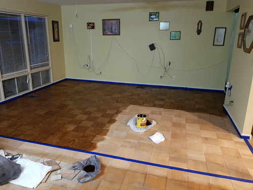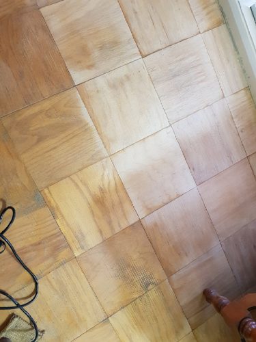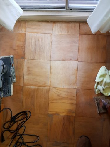 It’s still slow going, but I don’t want to use a floor sander because these are engineered wood, and given my inexperience, I’m afraid the tiles would be ruined. In any event, nobody has an orbital floor sander for rent, and since it’s parquet, I can’t sand with the grain using a drum sander. I’ll get there, though…eventually. The dark around the table is a shadow from the lamp, at least mostly.
