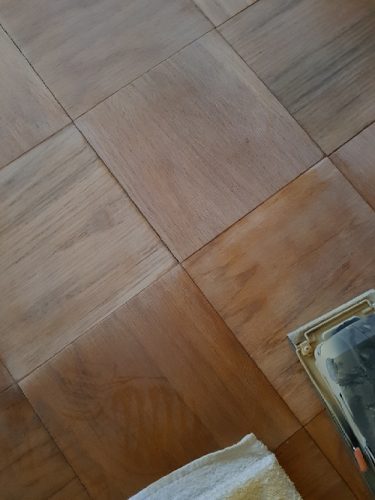 Getting into a groove now. I decided I did need a second coat even if I didn’t want to do the work. This has taken me less than 2h. Apply, allow to soak in, and after about 15 minutes, go back to the first part. My knees are still protesting, but they’ll just have to suck it up.