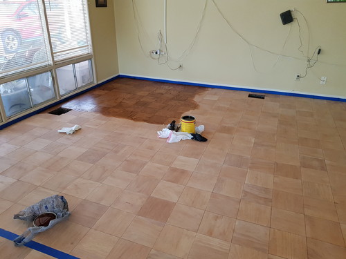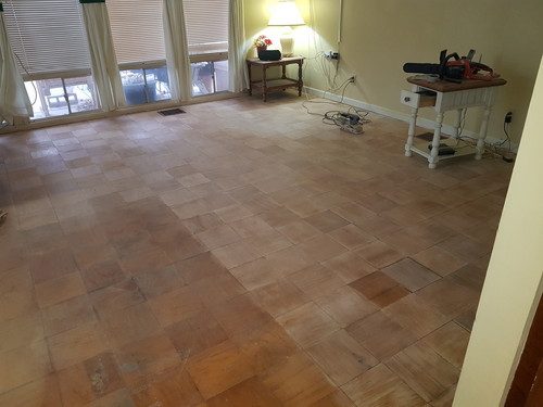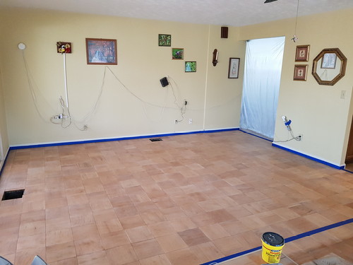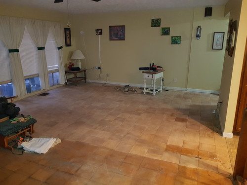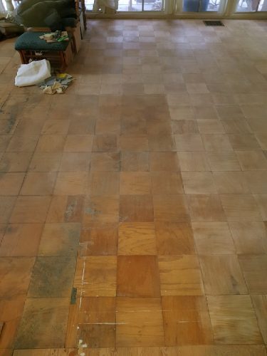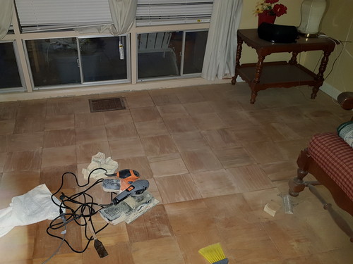 I finally got all the way to the wall, and did the extra row so I’m at the edge of the opening to the kitchen. The unsanded tiles are those that need to be replaced because they were cut out for a wall that was moved.
