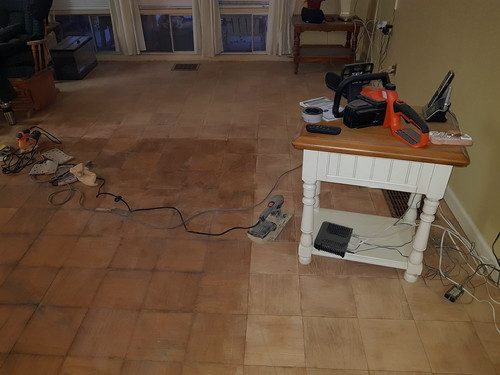 Taken the morning of 02-28-19. I’m doing laundry now, so I gave myself the evening off. I forgot to bring my replacement tiles home, too, but the weekend is coming, and hopefully P will spend time in the gradge, reading, so I can have some quality time with my sanders. Even with work, and not being able to sand after P gets home, I’m still making some progress.