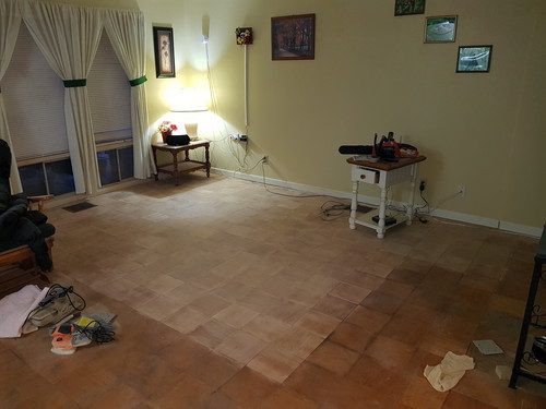 Better progress today than last Saturday. Still plenty to go, but at least I feel like I did something, and I didn’t cut myself again. The cut, BTW, is healing well. Yay, butterfly bandages and Ozonol! It’s so weird that Ozonol isn’t available here except on Amazon from sellers that have Canadian products; that stuff is the shit! Anyway, the floor progress as of quitting time today (1800h).