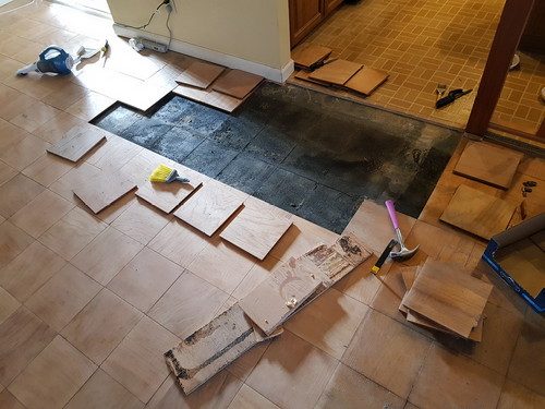 I got up early yesterday, and since P was very sick, and still in bed, I couldn’t start the finish sanding. I could (and did) figure out a way to cut off the extension of the kitchen underlay so that I could put in tiles. It wasn’t fun, it wasn’t easy, but I didn’t wound myself doing it, and I didn’t wake P with power tools, and that’s good enough for me! I took out tiles around the ones that needed to be replaced, which kind of made a scary mess, but I’m not easily frightened.