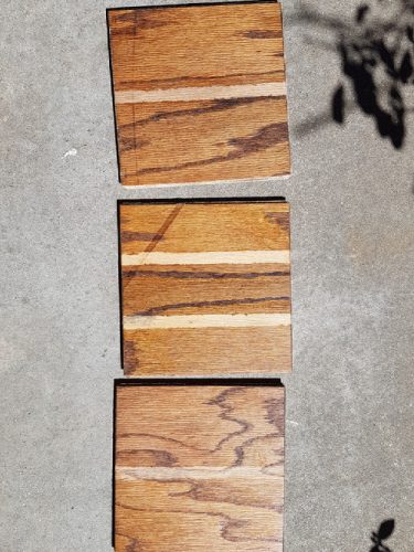 Just stain on two of them, stain and poly on two of them, indoor light. The top right is the Provincial that I decided I liked best, with 3 coats of water-based poly. Just in case, I put poly on one of the purchased tiles that has (top to bottom) Early American, Provincial, and Special Walnut. The Provincial seems the most neutral of the three, so I’m going with that, but I like Early American pretty well, too, so if I couldn’t get Provincial, that would be my second choice, and I wouldn’t be too disappointed.