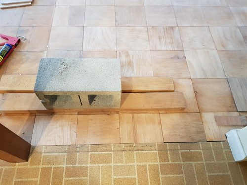 I’m not at all impressed by the tiles I bought–I can see why people don’t bother refinishing them, and mine are MUCH thicker and better quality–so I used the notched tiles to fill in where the underlay had been. They needed to be cut shorter anyway, so they worked. A couple of them weren’t in great condition, but I’d decided several days ago that I couldn’t get away with clear poly and would have to stain anyway, so again…meh.
