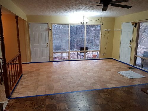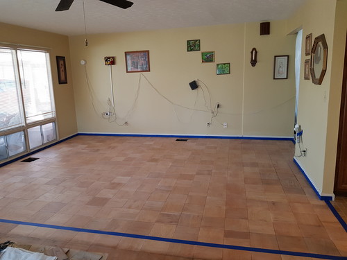 04-15-19 So, the sunshine doesn’t help, and a photo doesn’t really do justice, but this is the finished product, and I very much like my floor! Now, I just have to finish the rest of it. *sigh* I haven’t yet put the furnace vent thingies back because I had to unclog, pressure wash, and refill the pond after work today, so I didn’t have much time left after I took down the plastic and removed the tape.