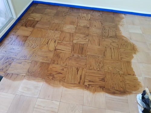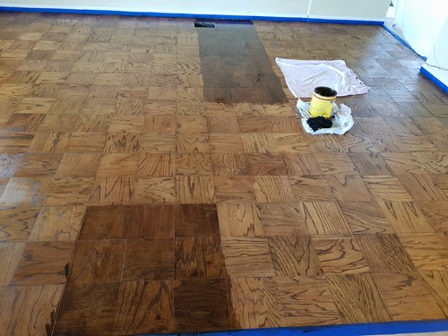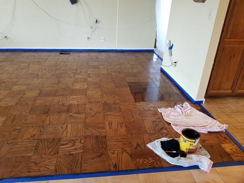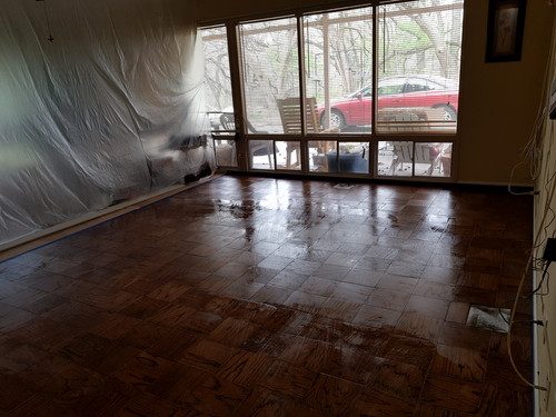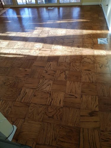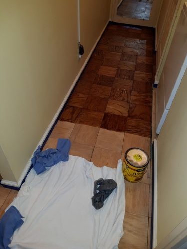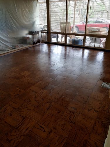 I was worried about the first coat because this stuff dries SO fast! I was slapping it on like I was cleaning the house at 4: 40 PM and Vance said, “DAD’S HOME!” It looked streaky, and I figured I’d have to sand this one because this was my first experience with water-base poly, and you can’t “apply with the grain” on parquet. Poor lighting because of the windows, but I hadn’t much choice.