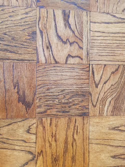 Since staining is quiet work, and I could sand individual tiles in the garage, I experimented with some stain colours. I had a little Colonial Maple and Early American left from the table, and I’d bought a little can of Provincial, then a litre of Special Walnut because it was on sale. I used the purchased tiles for the experimentation because I had only one (it was cut, but grain went the wrong way to use it at the doorway) of the good quality tiles, and wanted to use it for the colour I thought I liked best.
