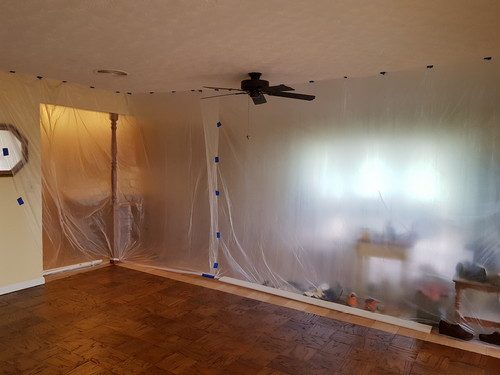 I dusted, vacuumed, dusted again, dusted some more, then put plastic up floor to ceiling, and ran over everything with tack cloths.