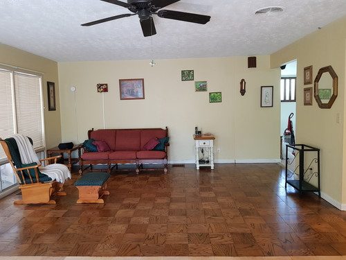 Well, it’s almost done. This side, at least. I washed down all of the furniture with Murphy’s, then put the heavy-duty felt feet on them so they won’t scratch my back-breaking (more like knee-breaking) work. I still have to iron the curtains and put them back up (Iron Curtains!), and if we ever get a day nice enough–and I don’t have to work–I’m going to pressure wash the rug before putting it back. It’s not filthy or anything, but it hasn’t been even steam-cleaned since we moved in, and I want it done properly. I also think I’m going to get a small TV to put on the black stand because I’d like to use my rocking chair again. Dunno. Anyway, I love my floor; it was a lot of work, and I still have plenty to go, but I love my floor.