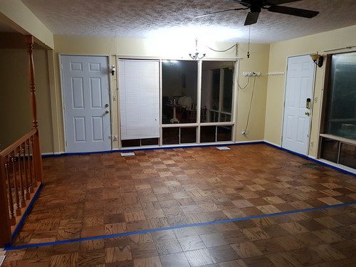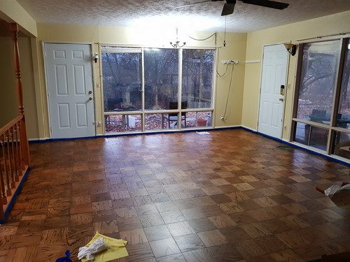 I finally decided I’d had enough of the ugly brown carpet. I never liked it, and after five years of Miffy pulling at the seam that ran right through the middle of the room, it looked bad enough that it had to go. I knew there was unit block parquet under it, but other than peeking at one corner and at the edges of heat registers, I had no idea what condition it might be in. I did not let that stop me. 😀