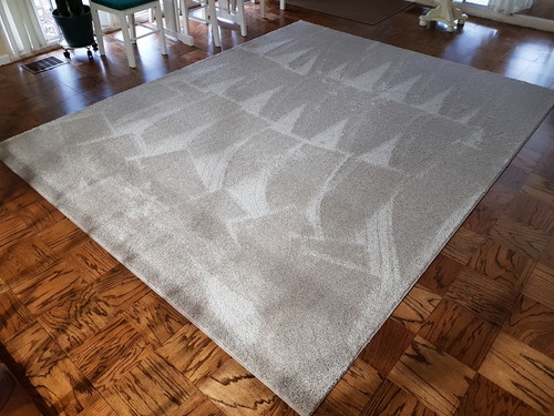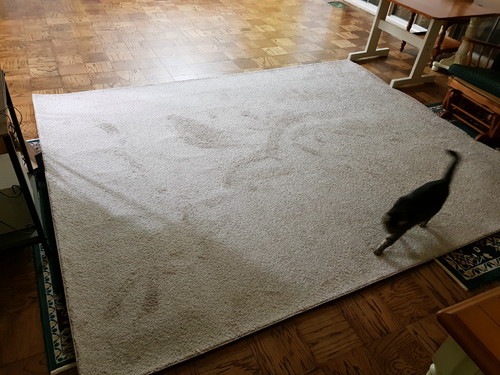 The colour of the rug was called “graham cracker”, but on no planet is a graham cracker this colour. I like it, though, and Miff gave it four circle-foot stamps of approval. Actually, he didn’t at first because he has to sniff everything new, but it smelled like new carpet and he thought it was STANKEH.