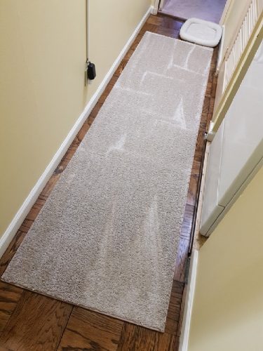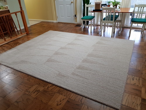 I waited three days for the poly to get to 90% cure, then took down the plastic. I didn’t put anything back then, though; I waited until this weekend. Plastic is down, and the rug I paid either $24.26 or $26.24 for on Amazon ($99.99, but I had points) arrived.