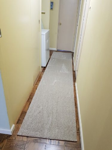 9′ long rug between my bathroom and the bedroom. I was initially unhappy that I couldn’t get a 10′ rug for this space, but seeing it in place, I’m actually glad it’s shorter because it just looks “right-er” (it’s a word!) than it would nearly pushed up against the 12′ rug, and it also leaves room for Miffy’s bed in his warm floor spot.