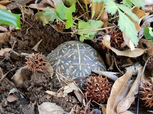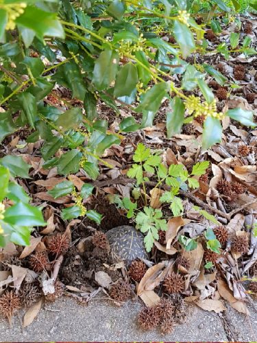 I thought that when it turned cold last weekend, Roxy would go back to her winter burrow, but she had other plans. I think she knew that it wouldn’t stay cold for long because I found her…in the spiky balls and leaves beneath one of the holly bushes by the patio! She didn’t dig far into the dirt; just enough that she would be safe from the cold and potential predators.
