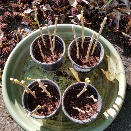 …the mulberry…cuttings. Probably an exercise in futility, but I decided to try it anyway. 16 red mulberry cuttings arrived yesterday, and FWIW, I dutifully potted them. Since they were barely damp upon arrival, I set the pots in a tray of water overnight, and removed it this morning because it’s raining anyway. They most likely won’t root, so I might also try seeds. Dunno. Anyway, they’re in pots with seed starting soil that holds moisture well, and rooting hormone.