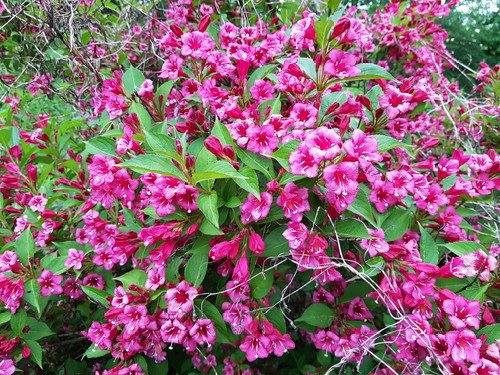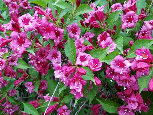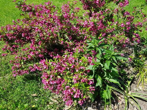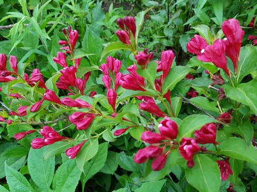 More weigela in Sarah-Flah’s Giant No-Mow Flowerbed, which is already a jungle. No wonder the MLBs hang around that area; it’s right by the fence of coral honeysuckle. Tubular flowers everywhere!
