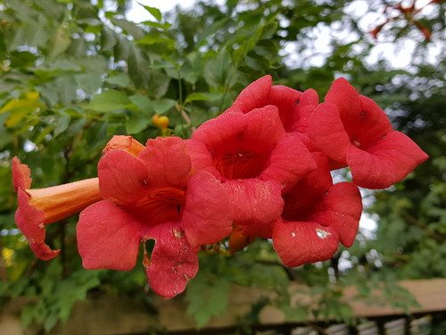 Actually taken 07-15-19. The trumpet vine bloomed fairly well this year, all things considered (crap soil, neglect, hot and dry, not really enough sun).