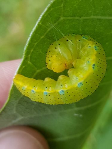 I actually didn’t recognize this guy because I’ve never seen one like him before, and the fact that he’d climbed milkweed to pupate didn’t help because that’s not what he eats. He’s a sulphur, and most likely a Cloudless Sulphur, of which I have plenty; in part because of the partridge pea that seeds itself. Interestingly enough, I discovered that caterpillars that feed on flowers develop the distinctive dark green stripes, but those that feed on leaves have no stripes. Pretty cool! 08-05-19