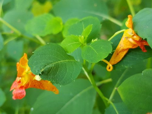 Jewelweed. Most of it didn’t survive the dry heat, but the plants clever enough to place themselves in the pond are doing fine, much to the delight of the MLBs.