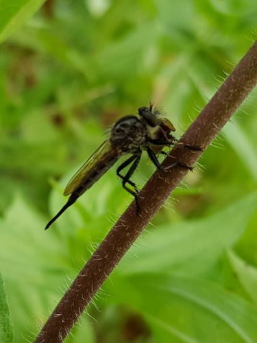 Not a great shot because it was getting dark, but the little robber was cute, so here he is. I can’t tell what he caught; it might be a planthopper, or a fly.