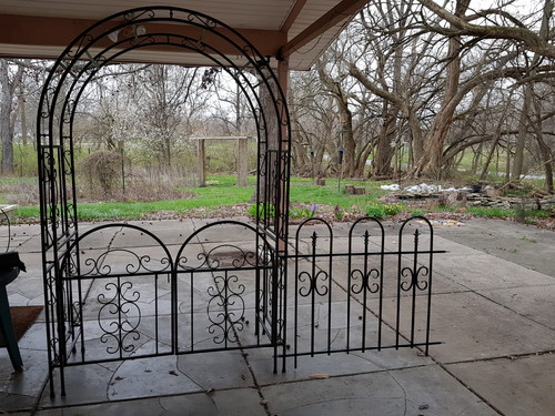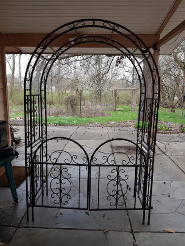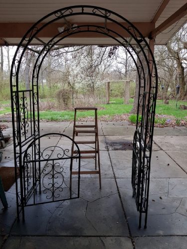 I finally decided it was warm enough to unpack the garden arch I got for P’s memorial floral installation. I was less than pleased to see that there was a little rust, and that it was under the powder coat, so it hadn’t happened in storage or shipping. It wasn’t, however, enough to warrant sending back a big, 65 lb box, and I had to paint the arch anyway to match the fence panels, so I just cleaned it well with a wire brush, then wiped it down with mineral spirits. It was damp yesterday, so not ideal for painting, but I’m pretty good with spray paint–Christ knows I’ve had enough practice–and if it took a bit longer to dry, it didn’t matter because I can’t install it yet anyway.
