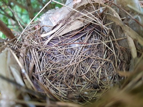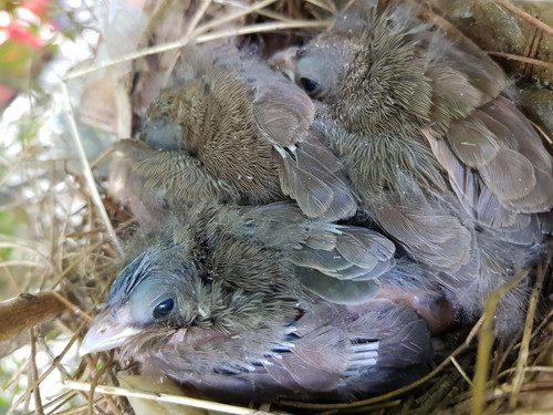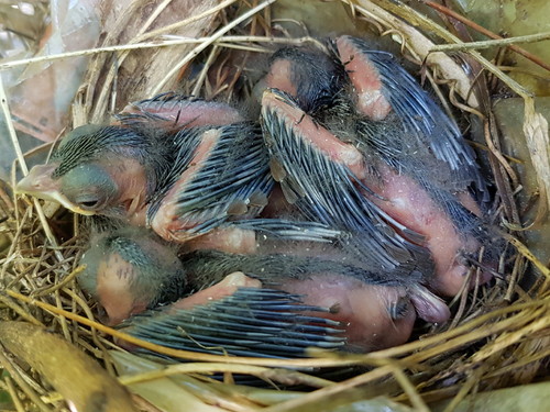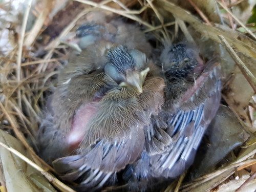 2019-06-09. Moving the branches definitely gets their attention because they think one of the parents has come to feed them. At this point, they eat, sleep, eat, sleep. Fevvers coming along nicely, eyes starting to open.