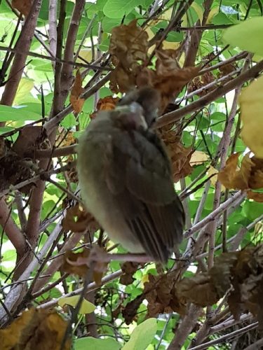 In the end, I just put him back in the smoketree because there was no spot where he’d be safe from cats, but visible to his parents, and I knew they were watching me, and also that they’d look in the nest tree if they couldn’t find him. They nearly deafened me with their PIK-PIK! PIK-PIK! calls to coax him to…wherever they wanted him, but eventually, they must have succeeded because I was on Catwatch Duty, and listened as they moved farther away into the edge of the woods, and calmed down.