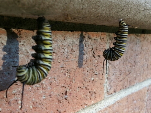 Here’s my one chrysalis, taken early this morning (hence crappy lighting). He must’ve just made it because even with a crappy photo, I can still see his baby stripes inside. Anyway, I’m at work, but I’ll look when I get home to see whether I have any more. There was one making a J on the siding of the house beside the place we like to sit on the patio to admire the yard. Hopefully he got the chance to make a chrysalis before a hungry predator spotted him.