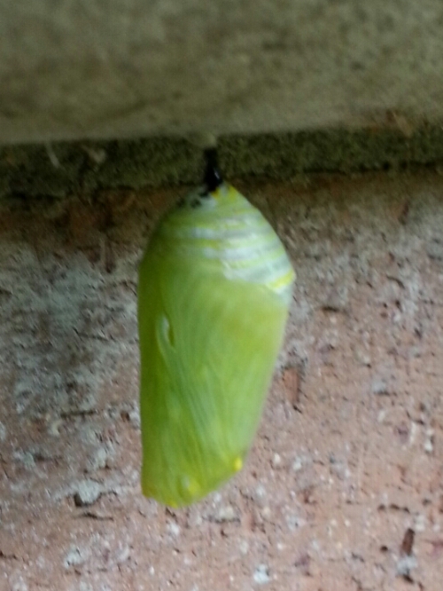 Well, I lost one to a wasp/something or other before the poor little dude had a chance to even consider being a pupa, let alone a butterfly, and I lost two more to spiders (one a very small spider actually seen fleeing the scene of the crime) somewhere between the point of “J” and “chrysalis”, but I have at least one pupa!